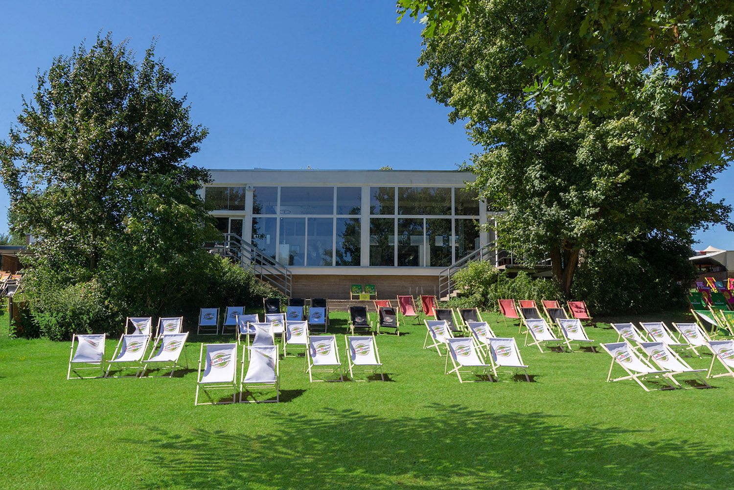 Freier Zugang zu den Außenanlagen – genießen Sie den schönen Ausblick auf den anliegenden See. Die Eventhallen haben einen freien Zugang zu den Außenanlagen, die auch gerne genutzt werden können. Ob Sportliches, zum Relaxen oder als Open-Air-Event, alles ist möglich.